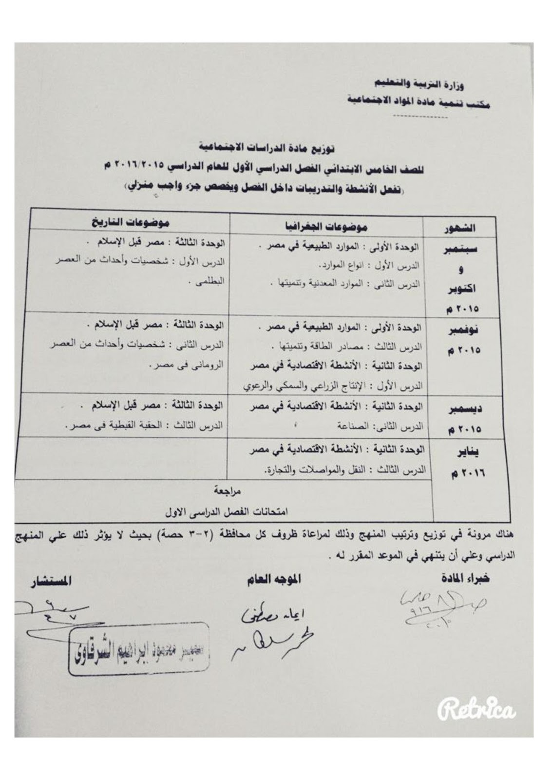 الدراسات الاجتماعية توزيع منهج الدراسات الاجتماعية للصف الخامس الابتدائى الترم الاول 2015 2016