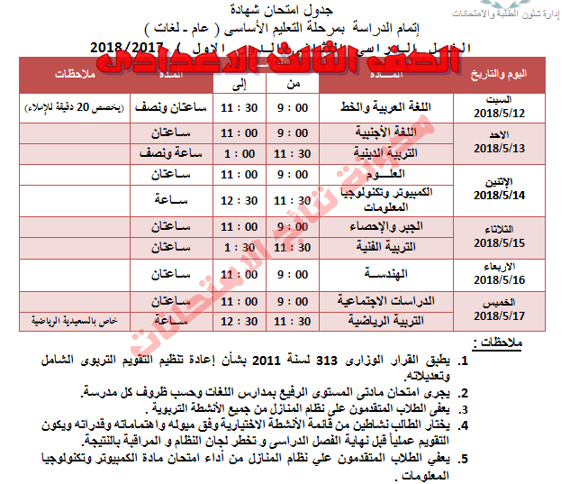 جدول امتحان الشهادة الاعدادية آخر العام 2018 جميع المحافظات جدول امتحانات الصف الثالث الاعدادي الترم الثاني 2018