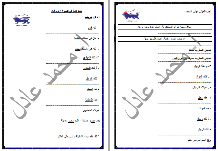 مذكرة نحو للصف الثالث الاعدادى الترم الثانى 2019 تلخيص النحو فى 3 ورقات