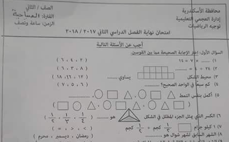 امتحان رياضيات للصف الثانى الابتدائى ترم ثانى 2018 ادارة العجمى محافظة الاسكندرية تم امتحانة فعلا