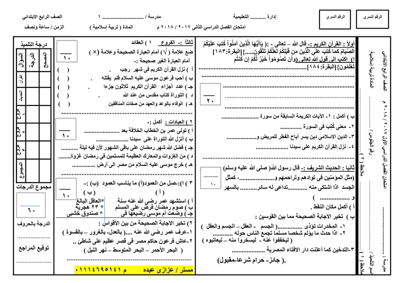 امتحان تربية دينية اسلامية للصف الرابع الإبتدائي الترم الثاني 2019