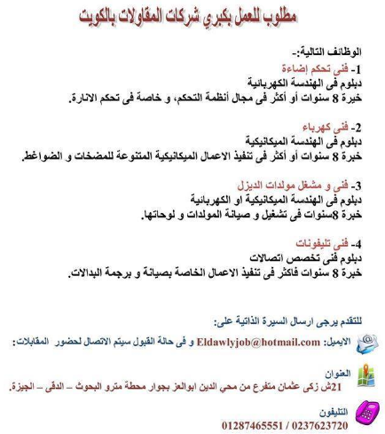 وظائف خالية للمقيمين في مصر بدولة الكويت والمقيمين داخلي بتاريخ الاربعاء 6 7 2016