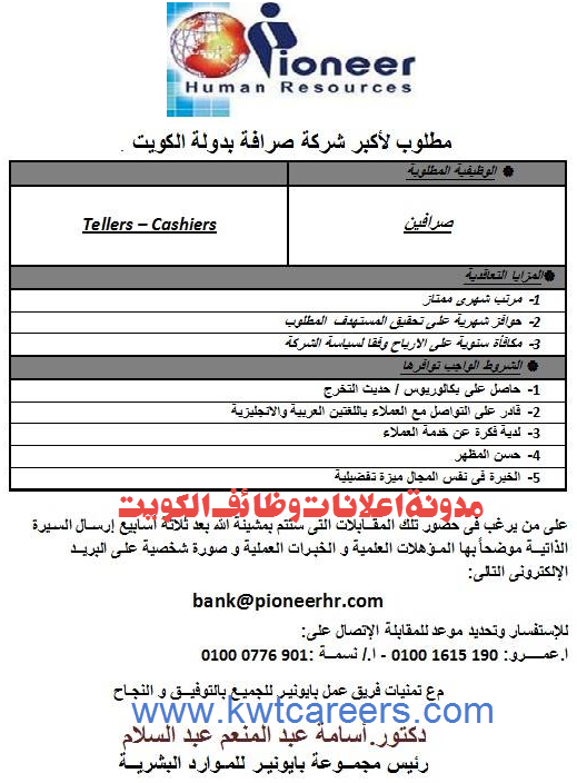مطلوب صرافين من مصر للعمل بشركة صرافة كويتية بمعرفة شركة بايونير لالحاق العمالة 15 7 2016