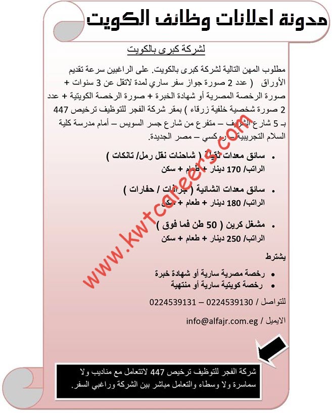 مطلوب سائقين معدات ثقيلة ومعدات انشائية ومشغل كرين للسفر لدولة الكويت من مصر الاثنين 9 5 2016