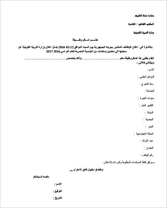 نموذج التقدم لوظائف معلمين وعلمات وزارة التربية الكويتية للمقيمين في مصر 2016 2017